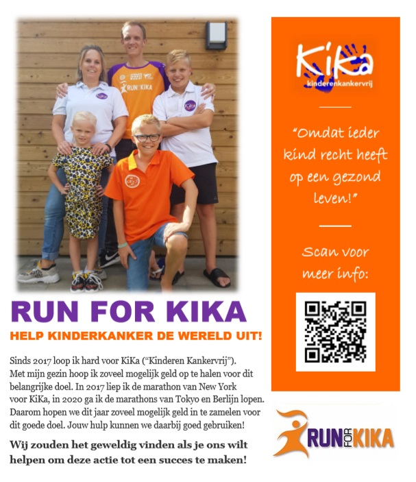 Inmiddels zijn we zo’n twee jaar verder en zijn Carla, de kinderen en ik weer enorm actief voor KiKa. Onze ervaringen van de afgelopen twee jaar hebben ervoor gezorgd dat we nog gemotiveerder zijn dan we al waren. Mede daardoor zijn we misschien nog fanatieker dan we al waren. Nu al hebben we meer geld opgehaald dat in 2017 en het eind is nog lang niet in zicht. Ons netwerk is nog steeds groeiende en de steun die we voelen en krijgen is enorm. En ik mag weer gaan hardlopen. Hardlopen voor KiKa. Dit keer niet in New York, maar in Tokyo (maart) en Berlijn (september). Een heel jaar lang staan mijn trainingen en wedstrijden in het teken van die twee bijzondere evenementen. Natuurlijk ben ik op veel meer plekken actief (o.a. mijn eerste triathlon!), maar alles opgebouwd rondom de twee marathons.