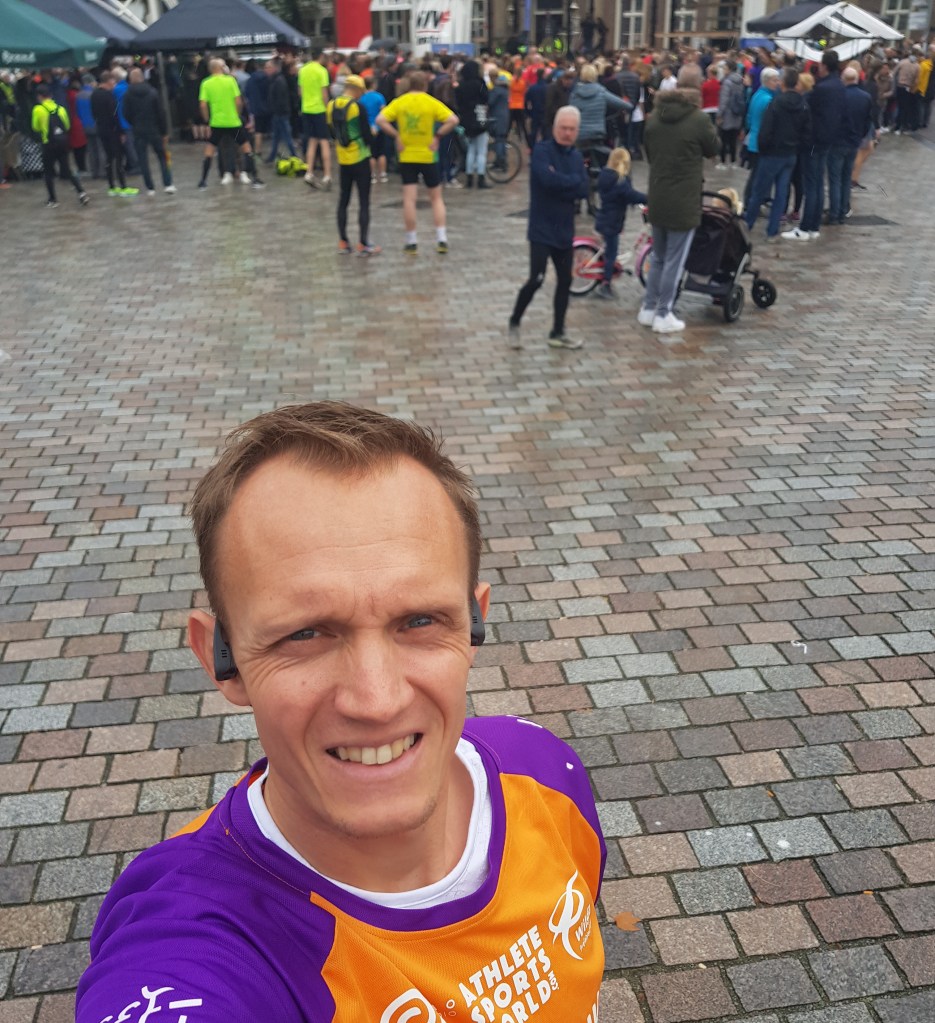 In Veghel verkenden we kort het startgebied voordat we naar de gymzaal liepen waar we ons om konden kleden. Onderweg kwam ik Bianca, Jolanda en Kees nog tegen. Altijd leuk om andere KiKa-runners tegen te komen. Zij stonden na hun 5 km te kijken vlakbij de finish. Mooi, hun aanmoedigingen zou ik straks goed kunnen gebruiken. In de gymzaal namen we rustig de tijd. Buiten was het fris, regende het soms zelfs een beetje, niet te vroeg naar buiten dus. Uiteindelijk stonden we mooi op tijd aan de start en hadden we zelfs nog kort kunnen warmlopen.