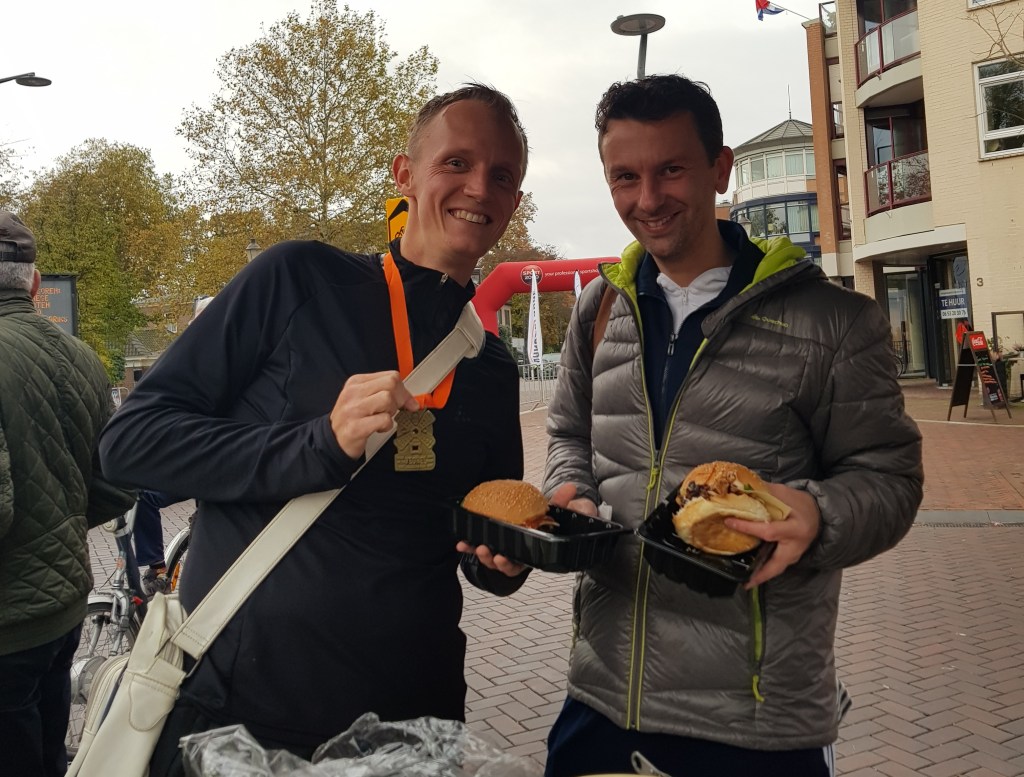 Niet lang na mij kwam ook Erik over de finish in 42:14, dus inderdaad die 42-er die hij wilde lopen. Allebei dik tevreden liepen we snel terug naar de gymzaal om ons om te kleden, waarna we op de markt nog even genoten van een lekkere hamburger. Dat hadden we wel verdiend!