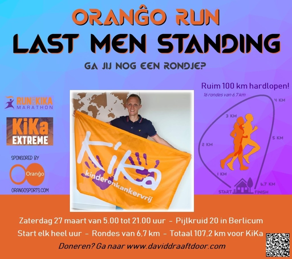 Op zaterdag 27 maart ga ik proberen om ruim 100km te lopen voor KiKa, als alternatief voor de marathon op Texel. Ik ga namelijk meedoen aan LAST MEN STANDING. Vanaf 5.00 uur start ik elke heel uur voor een ronde van 6,7 km. Tot aan de avondklok kan ik 16 rondes lopen, in totaal 107,2 km. Dat is dus ruim 2,5 marathon op één dag! Elke ronde start en finisht bij mij thuis. Dus: hoe sneller ik loop, hoe meer tijd ik tussendoor heb om te herstellen en te eten. Gaat het me lukken?