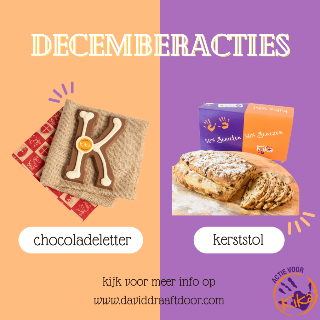 Ook dit jaar heb ik weer de traditionele acties voor de feestdagen: KiKa chocoladeletters en KiKa kerststollen. Natuurlijk gaat bij beide acties weer de helft naar Stichting Kinderen Kankervrij met als motto 50% genieten, 50% genezen. Via de links hieronder vind je alle informatie van de acties: